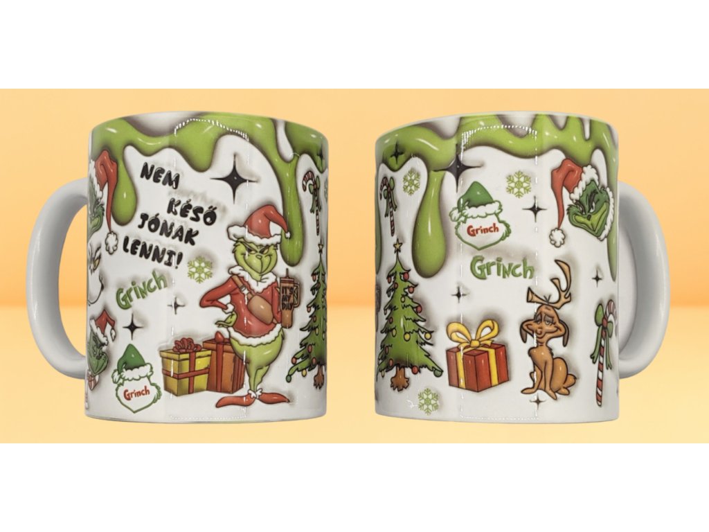 Különleges 3D hatású Grincs mintájú karácsonyi bögre, ami vidámságot csempész az ünnepi hangulatba.