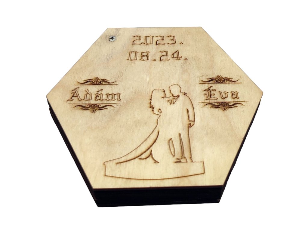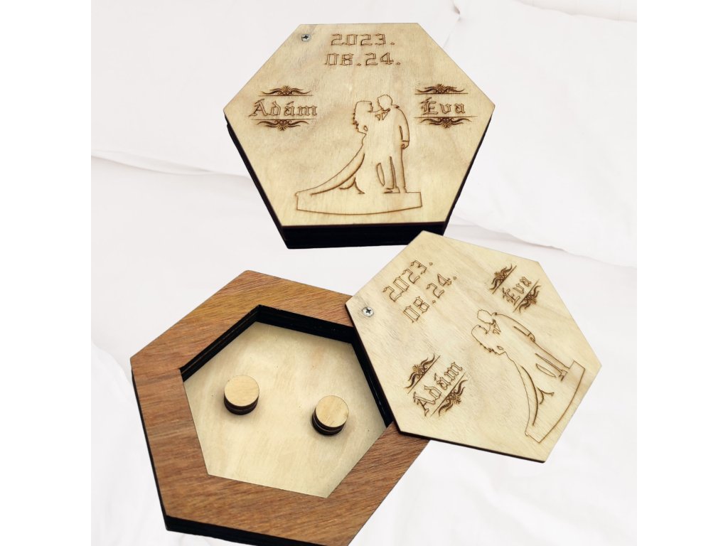 Teljesen egyedi terv alapján készült, gravírozott gyűrűtartó dobozka. Természetesen a nevek, szöveg, és grafika is választható. Az egyedi tervezés biztosítja, hogy nem egy olyan tömegcikkről van szó, ami lépten-nyomon visszaköszön az interneten. Ilyen gyűrűtartó csak egy lesz, és az alkalom utána is szép, maradandó emlékül fog szolgálni. A nevek, szöveg, dátum, grafika egyeztetéshez vegye fel velem a kapcsolatot, és mindenben segítségére leszek, hogy garantáltan megismételhetetlen darabhoz juthasson hozzá. E-mail: kapcsolat@cs-kreativ.hu