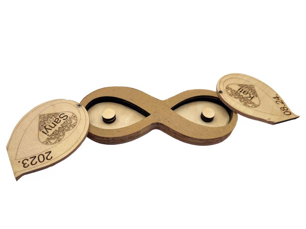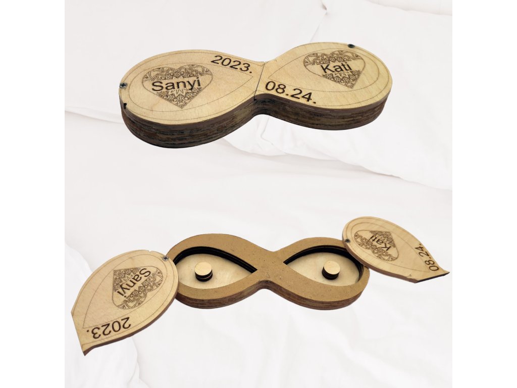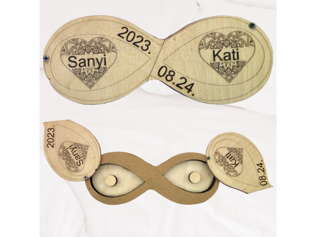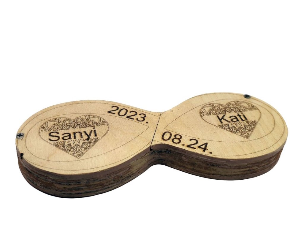 Teljesen egyedi terv alapján készült, gravírozott gyűrűtartó dobozka. Természetesen a nevek, szöveg, és grafika is választható. Az egyedi tervezés biztosítja, hogy nem egy olyan tömegcikkről van szó, ami lépten-nyomon visszaköszön az interneten. Ilyen gyűrűtartó csak egy lesz, és az alkalom utána is szép, maradandó emlékül fog szolgálni. A nevek, szöveg, dátum, grafika egyeztetéshez vegye fel velem a kapcsolatot, és mindenben segítségére leszek, hogy garantáltan megismételhetetlen darabhoz juthasson hozzá. E-mail: kapcsolat@cs-kreativ.hu